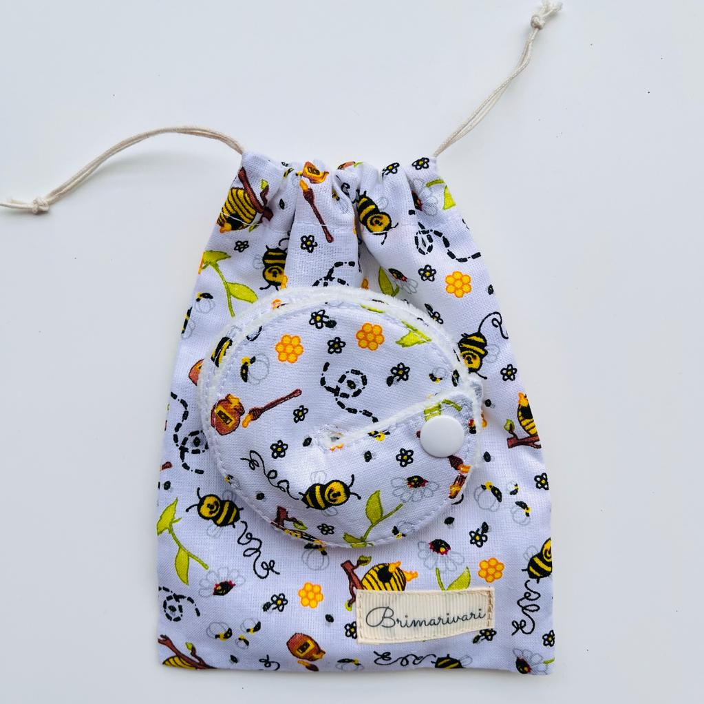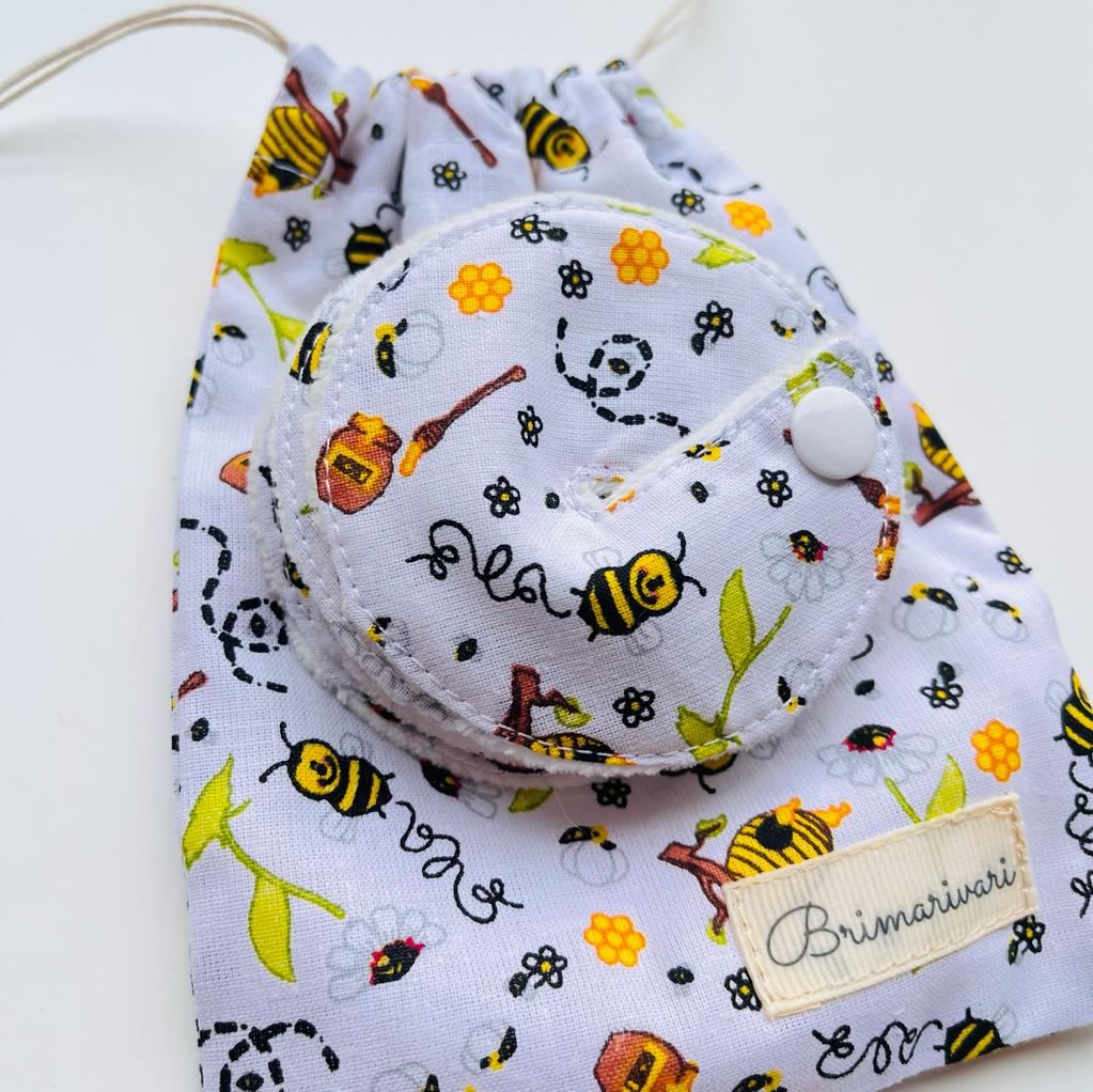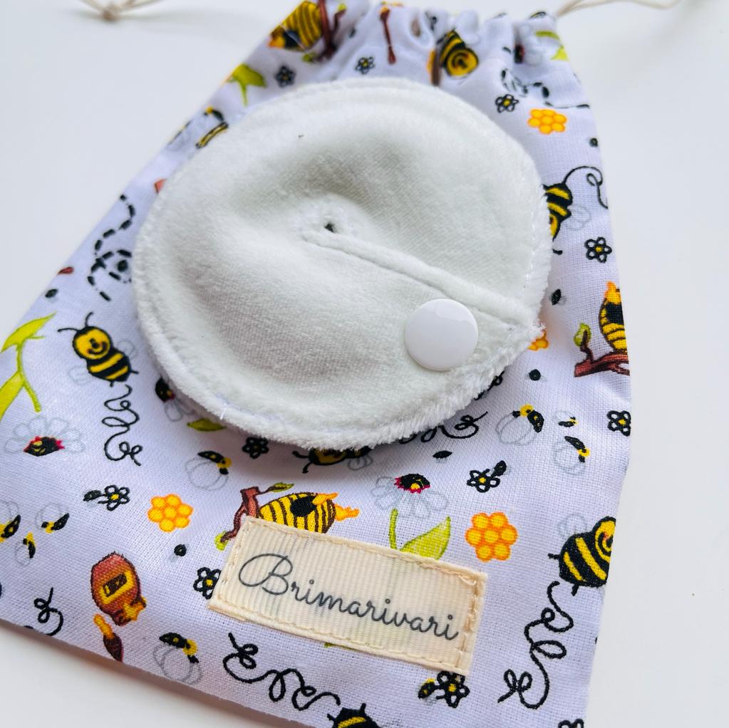 A korongok műanyag patenttal vannak ellátva a bőr irritáció elkerülése miatt. Felső rétege mintás pamutvászonból, míg alsó fele bébiplüss anyagból készült. (100% pamut)